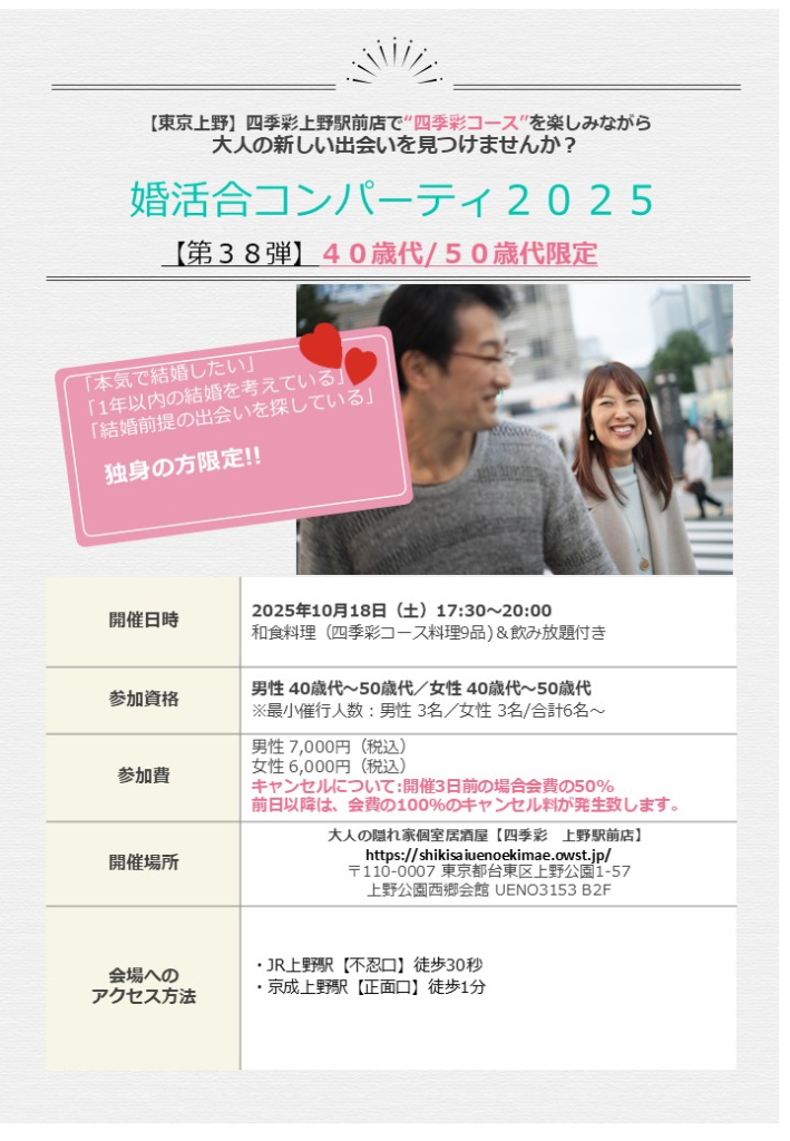 パーティー・セミナー内容 | 和食料理 四季彩コース料理9品&飲み放題付き翌日マッチング発表あり!(お問い合わせは所属の相談所まで)◆後日の1対1のお見合いはございませんので、ご了承ください。 |