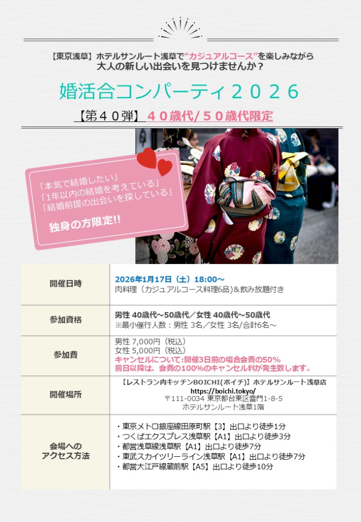 | 対象年齢 | 男性:40歳代~50歳代 女性:40歳代~50歳代 最小催行人数:男性3名女性3名(合計6名~) |