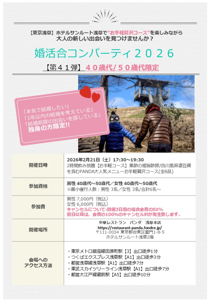 | 対象年齢 | 男性:40歳代~50歳代 女性:40歳代~50歳代 最小催行人数:男性3名女性3名 |